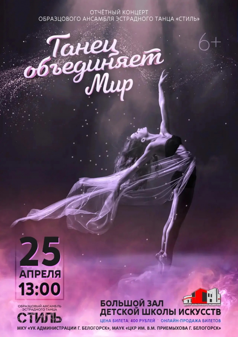 Вместе с ведущими зрители отправятся по мирам танца – Мир детства, Мир взросления, Мир родителей, Мир друзей, Мир учителей. Все эти миры объединены одним – танцем. Какой бы национальности не были, к какому народу не принадлежали, на каком языке бы не говорили - танец объединяет людей. В финале путешествия юные танцоры вместе со зрителями придут к Миру выпускников. Наступит время и им - выпускникам ансамбля, придётся уходить из родного коллектива, но рядом останутся – родители, педагоги и друзья. Неизменным останется одно – танец. КУПИТЬ БИЛЕТ